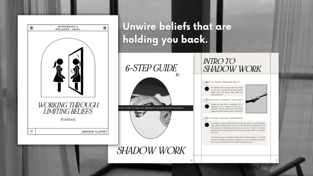 - Working Through Limiting Beliefs - In this workbook we "undo" your limiting beliefs. I take you through my 6-Step Shadow Work journaling process to unwire the blockages that are no longer serving you.